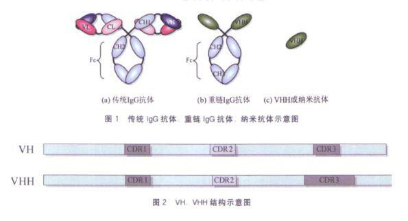 感染或者免疫过的骆驼或羊驼除了产生单克隆抗体外还会分泌一种独特的及仅有重链的抗体,这两种类型的抗体均有与抗原结合的能力。重链抗体缺少普通抗体所有的CH1区域,且CDR1和CDR3要比VH长,这在一定程度上弥补了缺失轻链造成的抗原结合力下降的不足。二者结构上差异如下图所示: